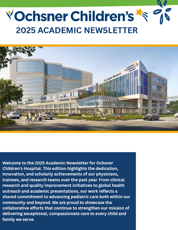 Welcome to the 2025 Academic Newsletter for Ochsner Children’s Hospital. This edition highlights the dedication, innovation, and scholarly achievements of our physicians, trainees, and research teams over the past year. From clinical research and quality improvement initiatives to global health outreach and academic presentations, our work reflects a shared commitment to advancing pediatric care both within our community and beyond.